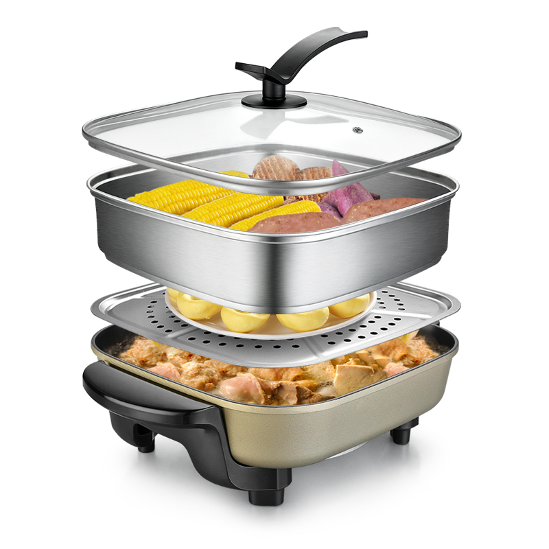 Low MOQ multi purpose fast heating food cooker hotpot with 304 SUS steamer frying pan nonstick electric skillet