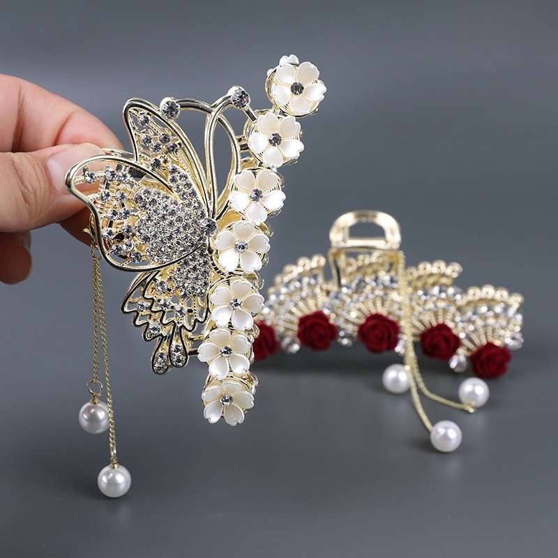 New Metal Rhinestone Butterfly rose flocked flower Shark Clip Fashion Head Ornament Hair Claw Catch Clips Back Head Hair