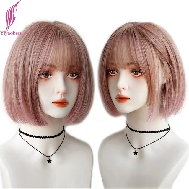 YIYAOBESS 14in Short Bob Wig, with Bangs Heat Resistant Easy to Put On Natural Color, Pink/Black/Brown