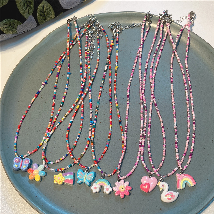 2023 Fashion Color Cartoon Heart Butterfly Beaded Necklace Sweet Cute Pendant Necklace for Girls