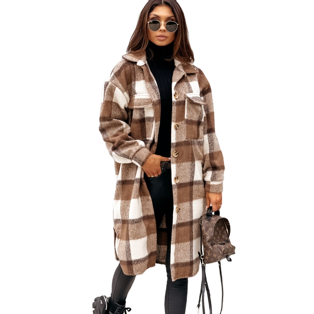 Women Casual Brushed Wool Flap Long Sleeve Coat With Pocket Lapel Single Button Long Plaid Shirt Coats For Ladies