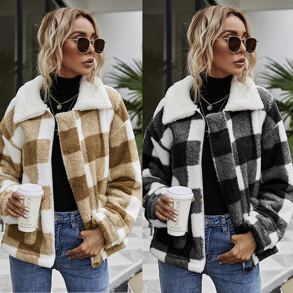 Fleece Zipper Womens Sherpa Lapel Long Sleeve Plaid Flannel Wool Coat For Women With Pocket