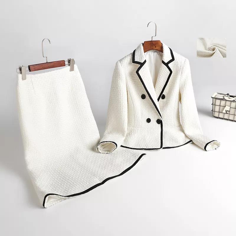Tweed Blazer Set White Woollen women Elegant Suits With Skirt