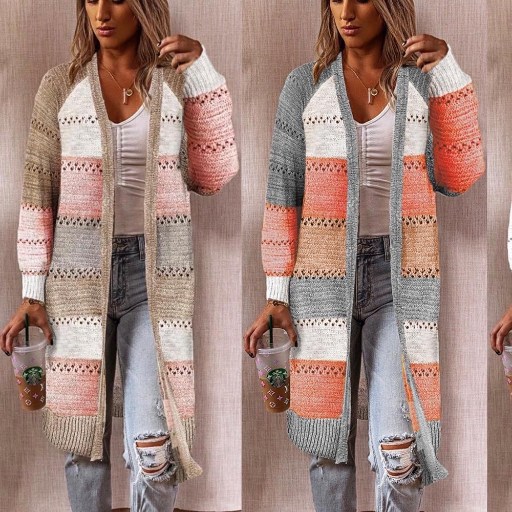 R46 cardigan Women Cardigan Comfy Stylish Stitching Long Sleeve Striped Patchwork Sweater Female Casual Long Tops