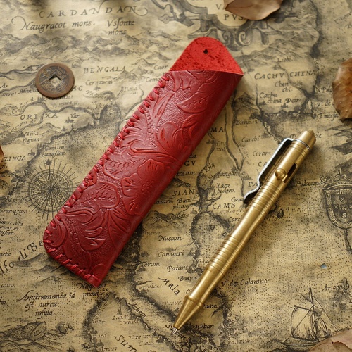 Genuine Leather Pencil Bag with Flower Embossed Leather Boy's and Girl's School Students Pen Holder Simple Retro Pencil